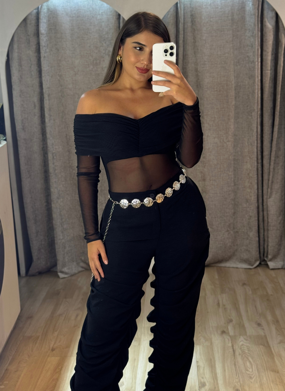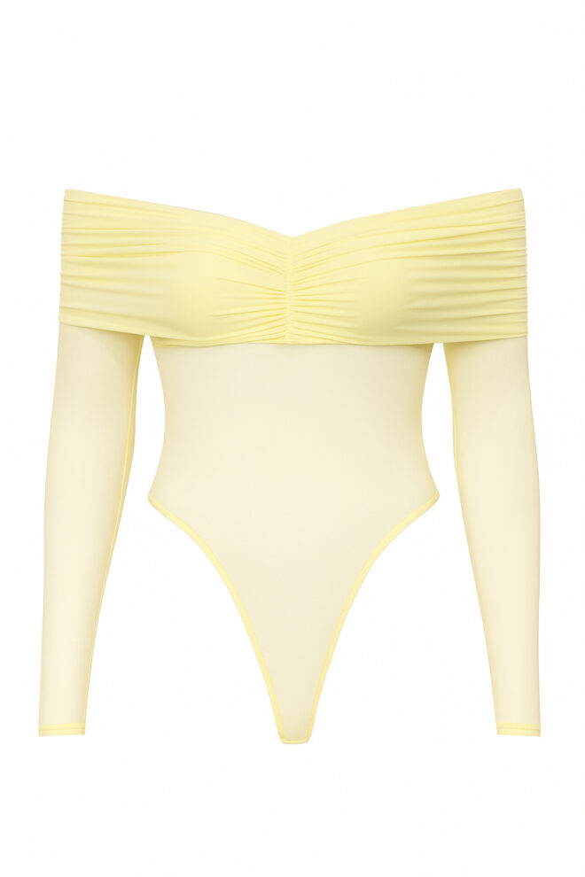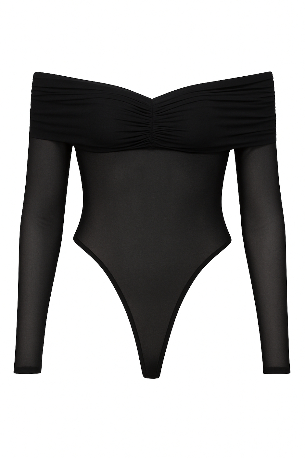 Añade un toque de dramatismo y elegancia a tu estilo con el Body Luxe, la pieza ideal para cualquier look sofisticado. Este body se destaca por su diseño de hombros descubiertos (off-shoulder) con un escote que presenta un exquisito drapeado o fruncido, creando una silueta femenina y favorecedora. Confeccionado en un tejido de malla (mesh) elástica, ofrece una apariencia ligera y semi-transparente, especialmente en las mangas largas y abdomen, que añaden un aire de misterio. Este body es versátil: úsalo para crear atuendos de impacto para la noche con faldas de cuero o pantalones de tiro alto, o incorpóralo en looks más casuales con jeans para un toque de elegancia inesperada.
