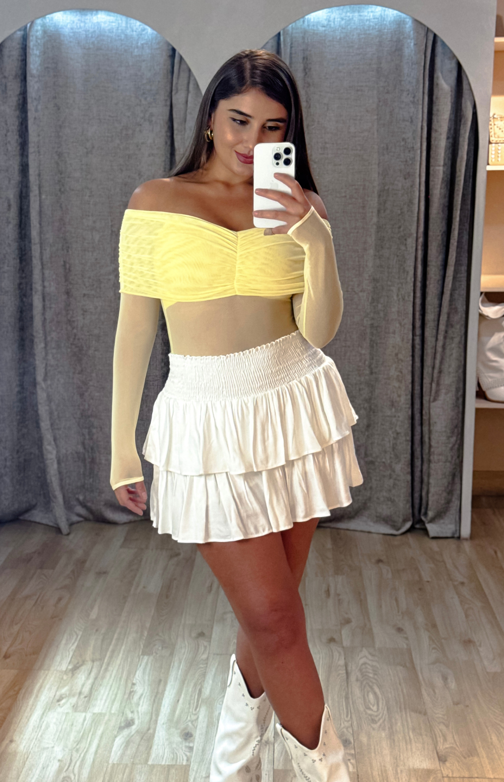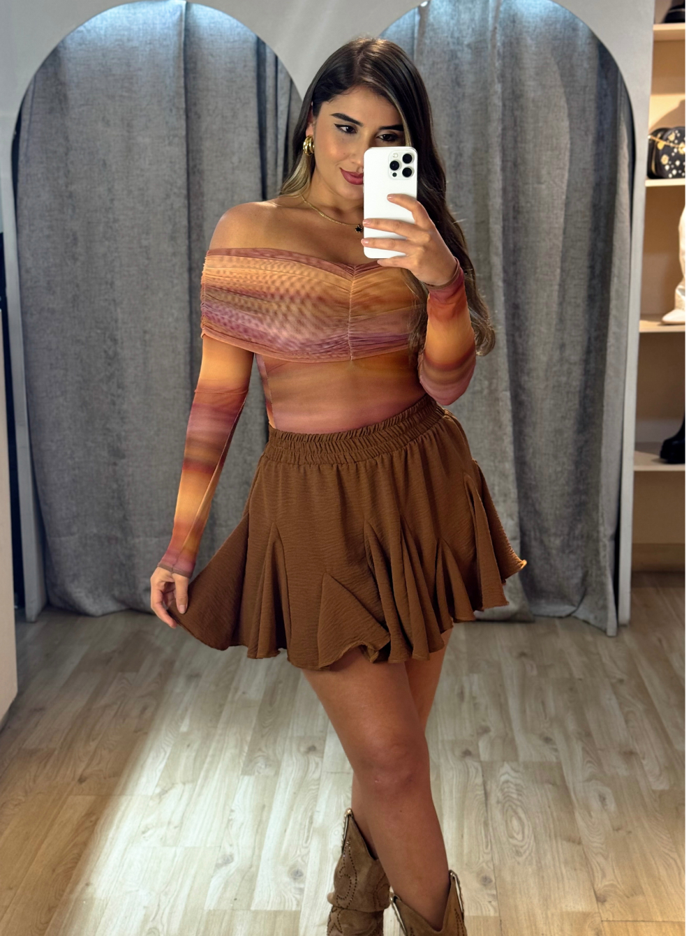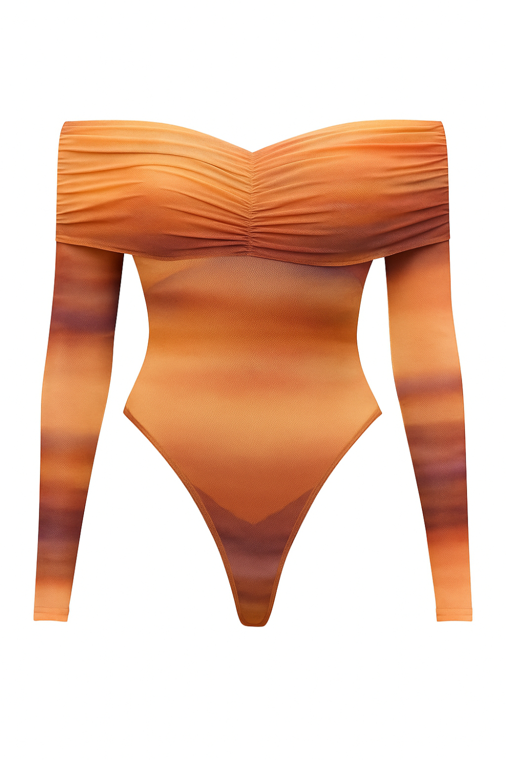 Añade un toque de dramatismo y elegancia a tu estilo con el Body Luxe, la pieza ideal para cualquier look sofisticado. Este body se destaca por su diseño de hombros descubiertos (off-shoulder) con un escote que presenta un exquisito drapeado o fruncido, creando una silueta femenina y favorecedora. Confeccionado en un tejido de malla (mesh) elástica, ofrece una apariencia ligera y semi-transparente, especialmente en las mangas largas y abdomen, que añaden un aire de misterio. Este body es versátil: úsalo para crear atuendos de impacto para la noche con faldas de cuero o pantalones de tiro alto, o incorpóralo en looks más casuales con jeans para un toque de elegancia inesperada.