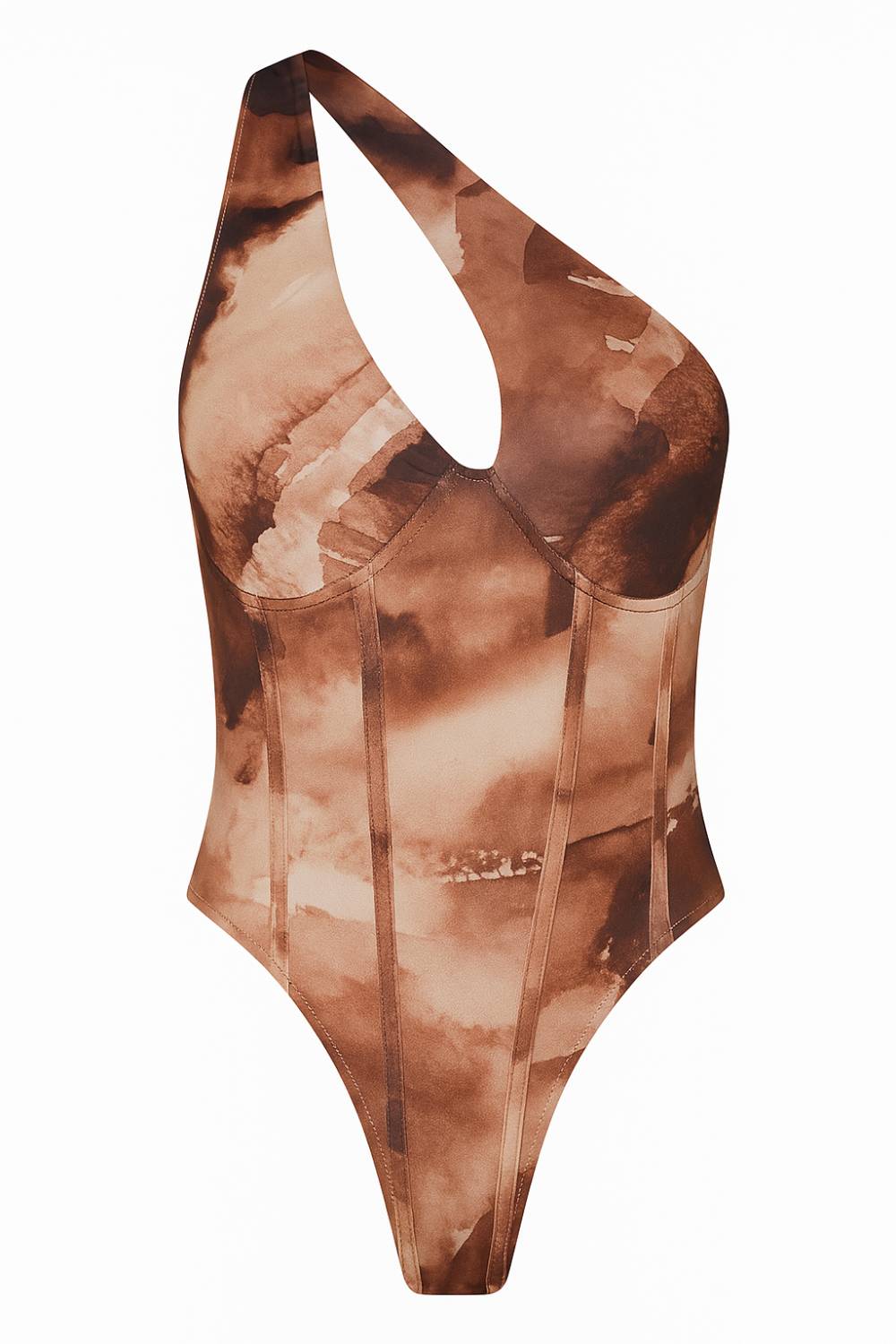 Body asimétrico de un hombro con cut out en el escote y estampado abstracto en tonos café/beige. Moderno, audaz y con ajuste perfecto.